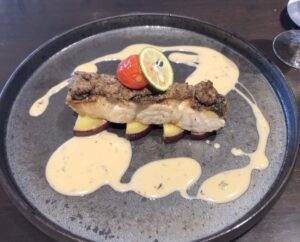 真鯛の皮がパリパリで、身はふんわり。白ワインのソースが美味しいです。さすがホテルクオリティ。