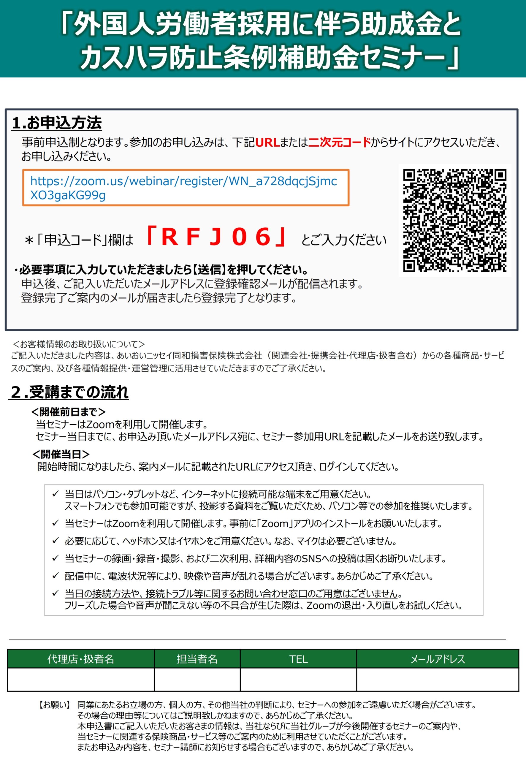 トップページイベント参加者募集!「外国人労働者採用に伴う助成金とカスハラ防止条例補助金セミナー」 2025.10.29 イベント 参加者募集!「外国人労働者採用に伴う助成金とカスハラ防止条例補助金セミナー」 渋谷区と地域の社会的課題を協働して解決していく「シブヤ・ソーシャル・アクション・パートナー協定」を締結している、あいおいニッセイ同和損害保険株式会社の協力で社会保険労務士の竹前彰氏を講師に迎え、企業が外国人労働者を採用したとき、カスハラ防止対策を講じたときに渋谷区から支給される補助金に関するセミナーです。 ZOOMで参加できるので、ご自宅や会社での参加もOK。お気軽に! 申込方法は下記をご確認ください。