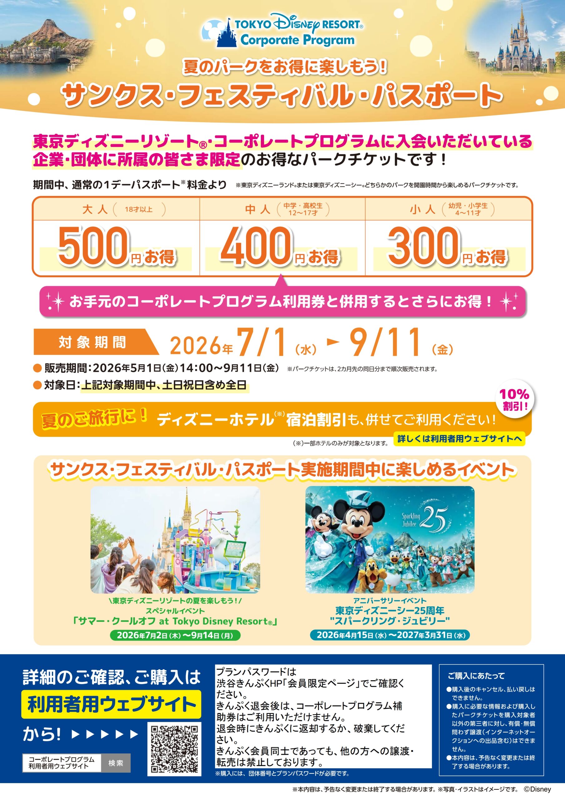 2026年度東京ディズニーリゾート®コーポレートプログラム利用券(利用期間 4/1(水)~2027年3/31(水))を配布中です。